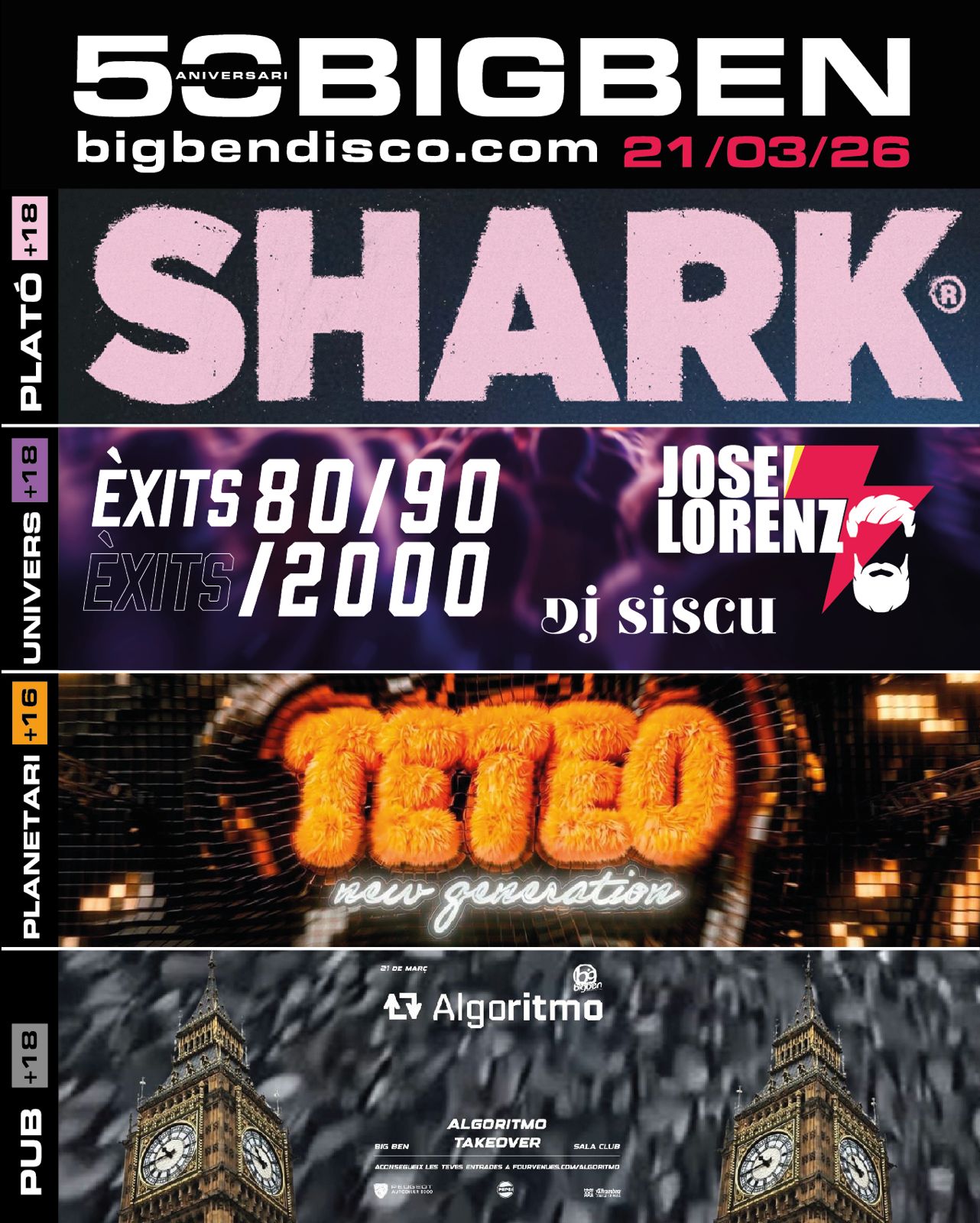 A la sala principal tindrem Shark, una de les festes amb més creixement de la península i de les més estimades i esperades pel nostre públic. Que hagin volgut ser presents en aquest 50 aniversari té un significat especial per nosaltres. És un orgull i també un premi poder compartir una nit així amb una festa que connecta tant amb la nostra gent i amb el que representa Big Ben.